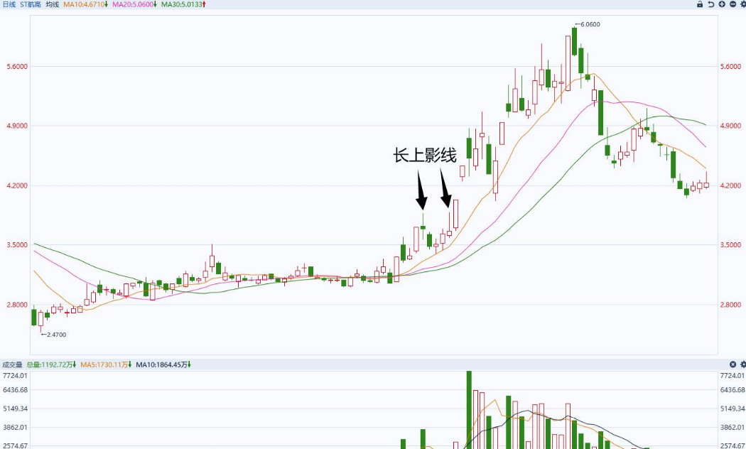 如图1-1所示为ST航高(002665)走势图,该股在22日与28日两个交易日先后形成两根冲高回落的长上影K线,清晰呈现主力试盘动作,上方抛压痕迹明显。29日早盘,股价先进行试探性上攻,在触及前期压力区域附近后主动回落进入整理阶段,这过程既消化了短期获利盘与套牢盘,也进一步测试了下方承接力量;午后,股价突然放量拉升,快速突破前两根K线的高点。该突破动作清晰且明确地传递出主力资金的做多意图,此时及时跟进买入,通常能够借助主力拉升的动能获得可观的短线收益。从实际走势验证来看,该股在突破后当日便强势涨停收盘,后续多个交易日更是呈现连续上涨的态势,充分印证了该策略的有效性。
