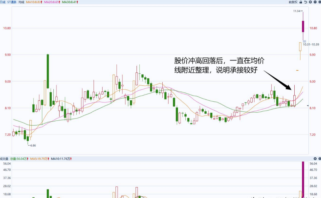 如图2-1所示为ST通脉(603559)走势图,该股在主力试盘后进入短期整理,期间多次回踩分时均价线均能快速获得有效支撑,未出现有效跌破的情况;从日线级别分析,30日均线构成中长期防线,在股价回调过程中,每次触及30日均线附近时,都能引发资金主动买入,推动股价快速反弹,印证了该股存在大资金长期布局、强力承接的态势,为主力后续拉升奠定了基础。这种多周期共振的支撑效应,大幅提升了分时低吸的安全边际。当分时图中出现股价短暂跌破均价线并在极短时间内快速收复失地,且收复时伴随成交量温和放大的形态时,即是最为理想的低吸机会,盈利空间更充足。