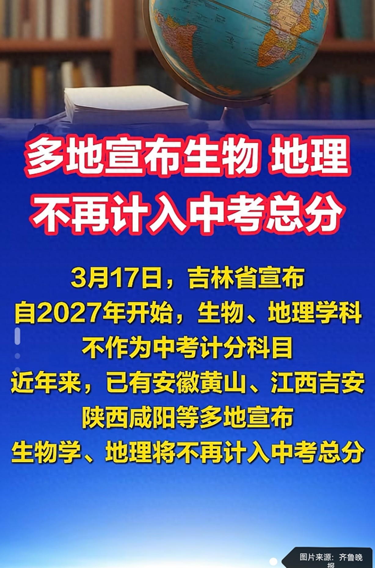 最近,吉林、安徽黄山、江西吉安、陕西咸阳等多地接连发布通知,从2027年开始,生物、地理这两门学科将不再计入中考总分,改为等级考查或开卷考试。这意味着,原本要和语数英一起算进升学排名的“小副科”,现在只需要达到合格等级就行,不用再为了几分熬夜刷题。不少家长和学生都炸开了锅,有人拍手叫好,也有人忧心忡忡。