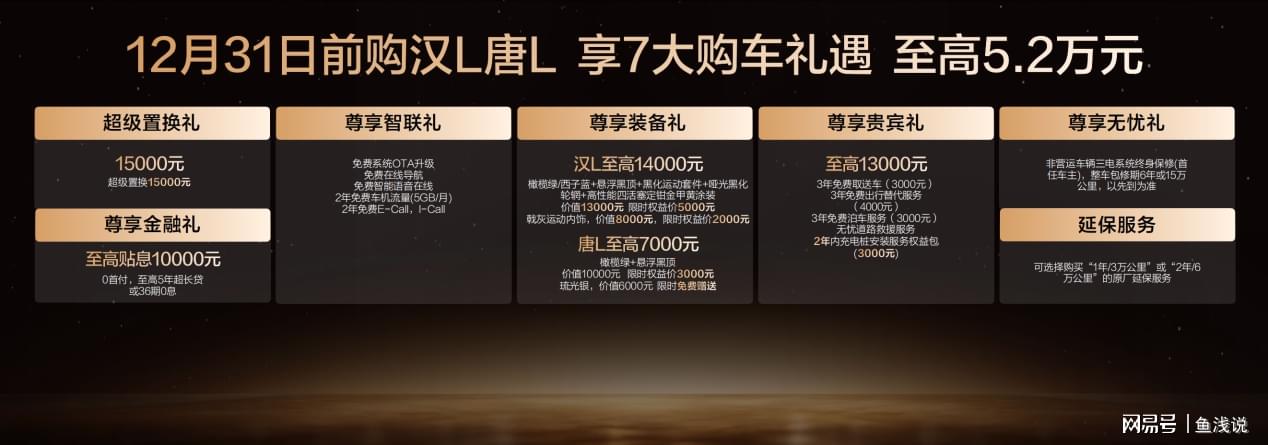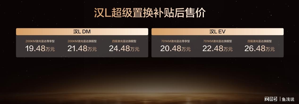 此次,汉L EV共带来3款车型,补贴后售价20.48万~26.48万元;汉L DM 3款车型,补贴后售价19.48万~24.48万元;同时,比亚迪还为用户准备了包含置换补贴在内的至高价值5.2万元尊享礼遇。(以上权益截至12月31日)