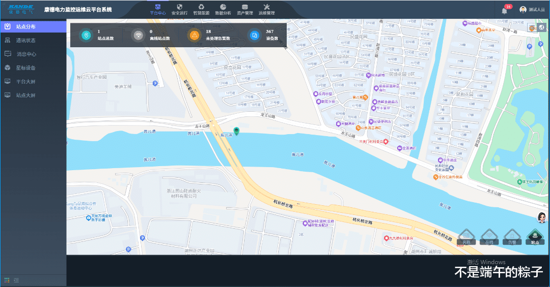 区域内站点的状态、各类统计信息一目了然,结合电子地图显示配电室的分布情况,并汇总配电室所数量、累计装机容量、累计运行容量等信息,点击站点图标可跳转至配电室详细信息。