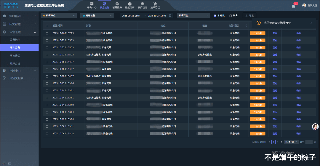故障报警管理主要实现对配电室设备运行故障的监视功能,实现即时告警,精确定位。通过故障管理功能,用户可对告警进行实时的监控,系统提供了故障智能诊断功能,以提高故障发现、故障处理的效率,减小故障造成的影响,更加有效的保障安全运行;云平台为用户提供了告警的实时监控浏览与查询。