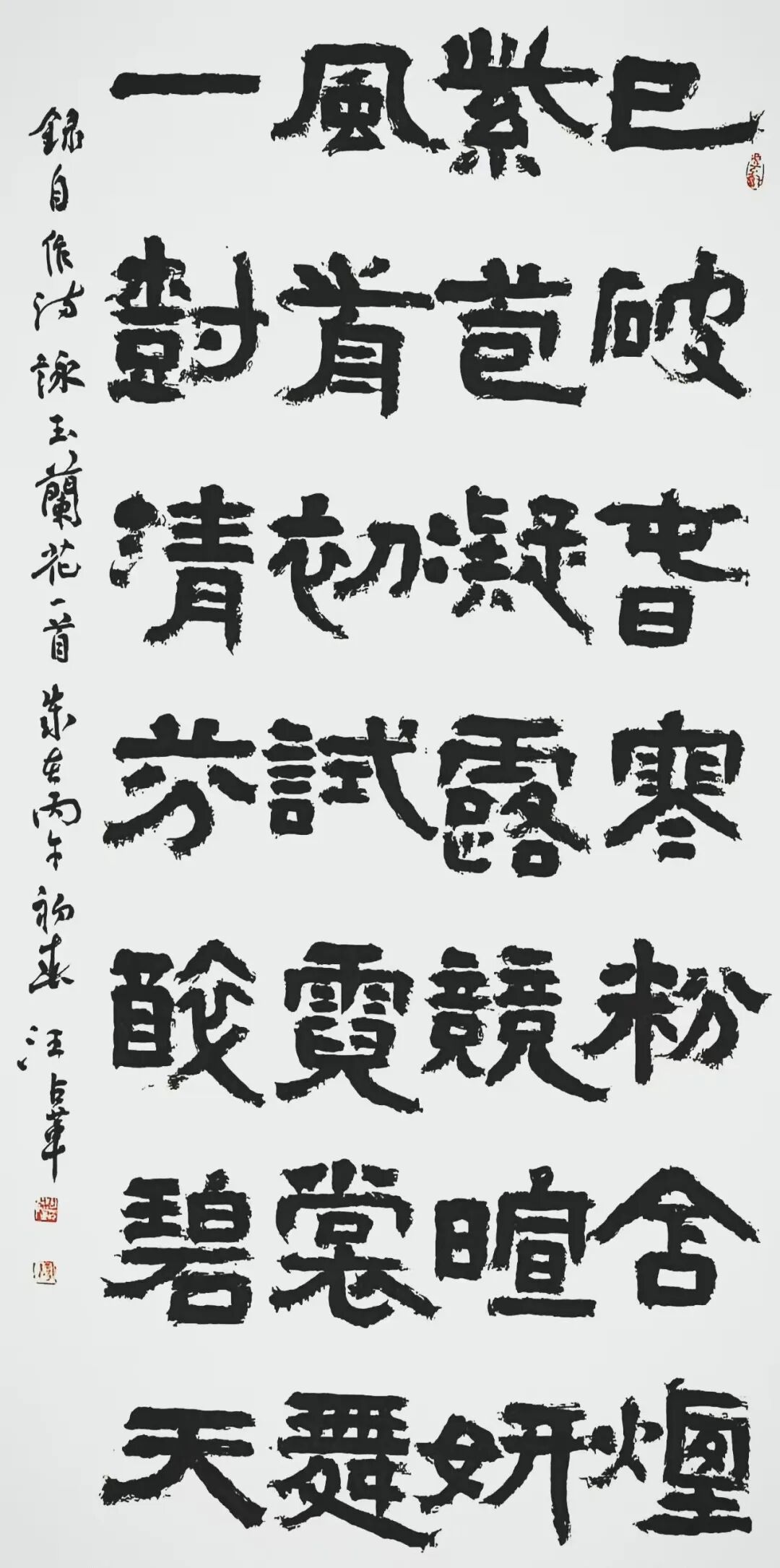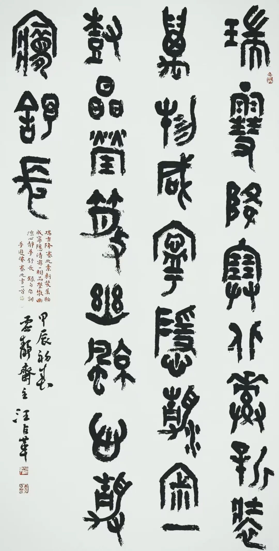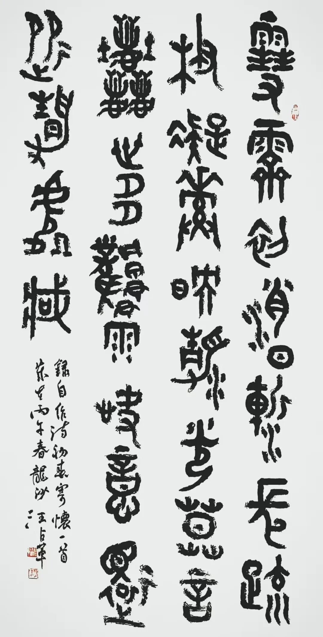 汪占革 号愚盦,别署虚静斋、三百悟石堂。国家一级美术师,中国书法家协会会员,中国楹联协会会员,九三学社中央书画院成员,西泠印社社友会会员。黑龙江省书法家协会理事,篆书委员会副主任,篆刻委员会委员。齐齐哈尔大学硕士研究生导师,齐齐哈尔市政协委员,九三学社社员,市书画院副院长。书法篆刻作品参加中国书法家协会主办的各项展览三十余次。获奖入展情况主要有:全国第七、八、九、十二届书法篆刻作品展,全国第八届中青展,第二届兰亭奖展,全国第五、六届篆刻展,全国第五、七届楹联书法作品展,第四届中国书坛新人展,第二、三届篆书展,“深入生活、扎根人民”——第四届“文质兼美”优秀基层书法家创作活动作品成果展。荣获首届“杏花村杯”全国电视大赛铜奖,全国首届篆书作品展提名奖。有十余篇论文在专业报刊上发表,二OO四年被授予首届黑龙江省书法家协会“德艺双馨”会员称号,著有《汪占革书法篆刻》、《汪占革篆刻》作品集。
