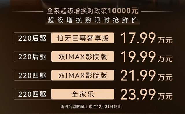 1、220后驱伯牙巨幕奢享版作为入门版本,限时抢鲜价17.99万元,已标配30英寸一体寰宇屏、伯牙之音23扬豪华音响系统等豪华配置,性价比极为突出。