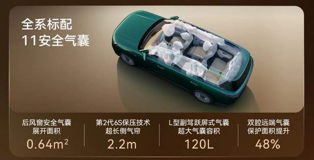 03、安全性能安全是风云T11最为突出的核心卖点。新车全系标配磐石车身2.0安全系统与11个安全气囊,就连后挡风玻璃都有两个气囊,安全方面奇瑞做得还是很足的。