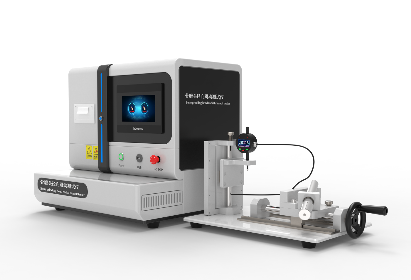 骨磨头径向跳动测试仪是专为骨科医疗器械设计的精密检测设备,用于测量骨磨头在旋转时相对于中心轴线的径向偏移量(即跳动值),确保其加工精度与临床使用安全性。通过高精度传感器和数据处理技术,实时监测骨磨头旋转时的径向位移,量化其跳动幅值与频率。
