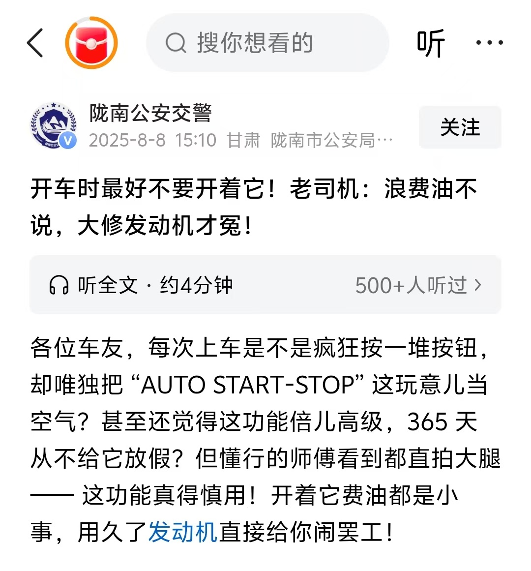 这文章就发在了交警的实名账号中,算是给这件事情定了个性,自动启停就是不好,大家伙没事儿别老是开着它。