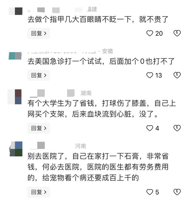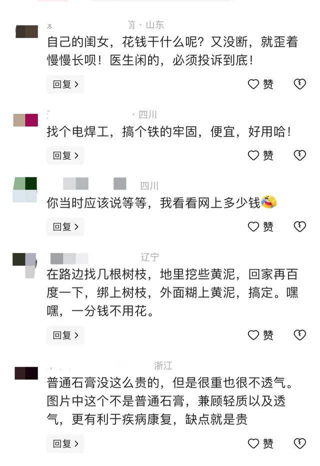 有网友热心为这位家长科普医生为什么要打石膏,石膏固定不一定单纯是为了骨折,还分析了这种材料的性能和价值以及医生的技术等问题。也有网友戏谑地建议家长不用打石膏,自己百度,去山上找材料,自己做,500元也省了。