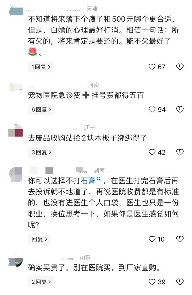 有网友指出该家长不厚道,医生打完石膏后转手就要投诉医生,嫌贵不同意可以在医生打石膏之前就拒绝的,腿瘸和500元哪个更重要呢?