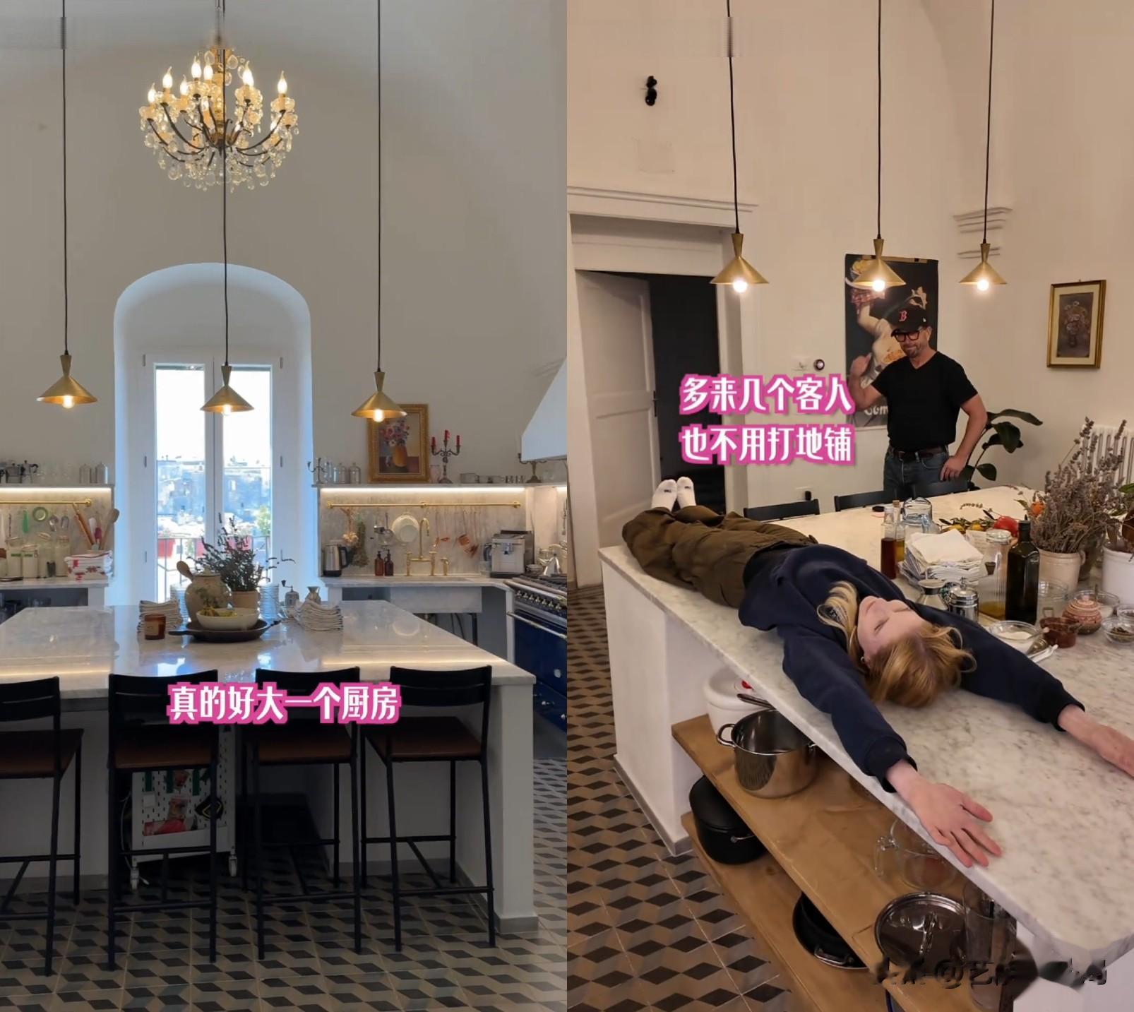 面积大到可以同时容纳十几个人,大理石岛台能躺下好几个星悦。