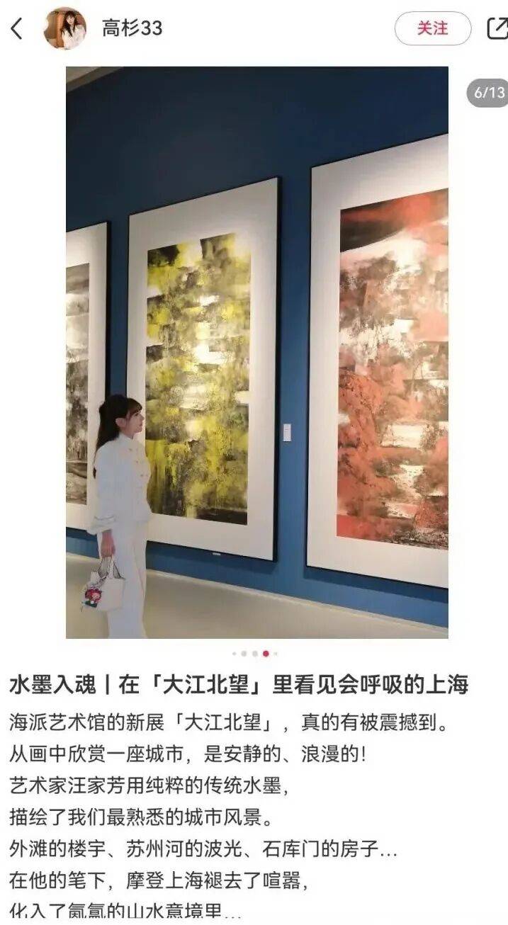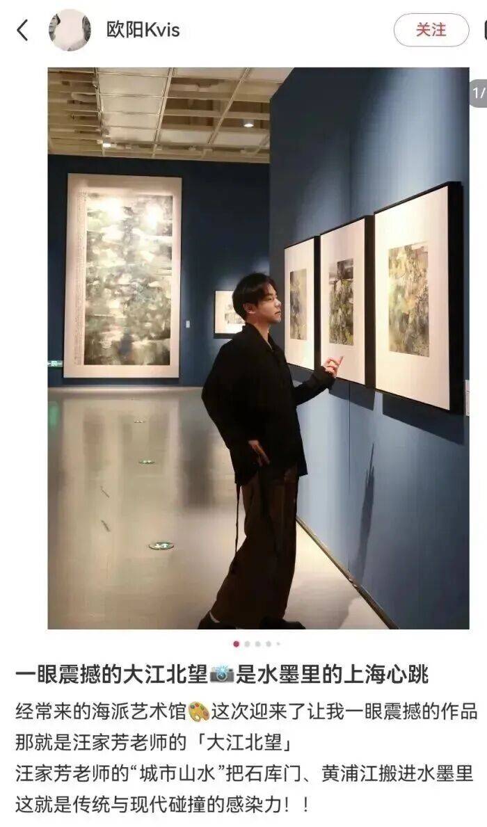 穿了一身黑色新中式连衣裙去看展,没想到和汪家芳老师的“城市山水”如此契合。当传统水墨的笔触勾勒出我熟悉的外滩和苏州河,从小就住在苏州河边,那种厚重笔墨下的灵秀,一下子抓住了我,特灵了! - 另外那幅《西岳华山》系列也很nice,水墨晕染开的巍峨群山,充满视觉冲击力 - 整个空间通透安静,很适合慢慢走、静静看。如果你也喜欢这种传统与现代的对话,推荐你来感受一下 #⼤江北望#汪家芳#海派艺术馆#上海看展#城市⼭⽔#魔都看展#周末去哪⼉