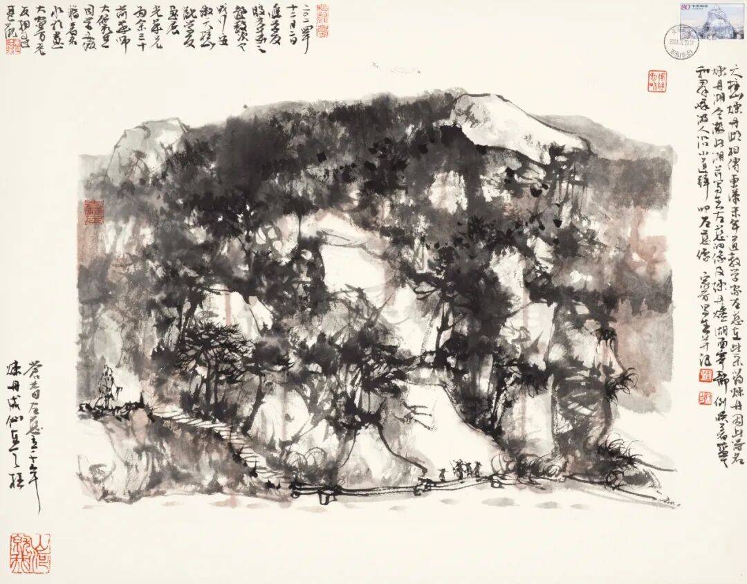 巨幅水墨《上海》将江南文化、红色文化与海派文化交融于城市意象之中;《闵行十二景》以细腻笔触展现黄浦江畔的人文烟火;《五岳归来》以苍劲笔墨勾勒华夏风骨;《画徐霞客游记》则以行走的笔触串联古今山水情怀。