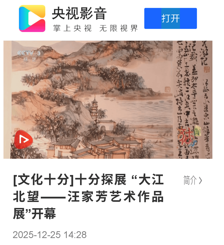 2025年12月23日汪家芳《大江北望》开展,中央电视台及时报道,得到有关部门的重视。