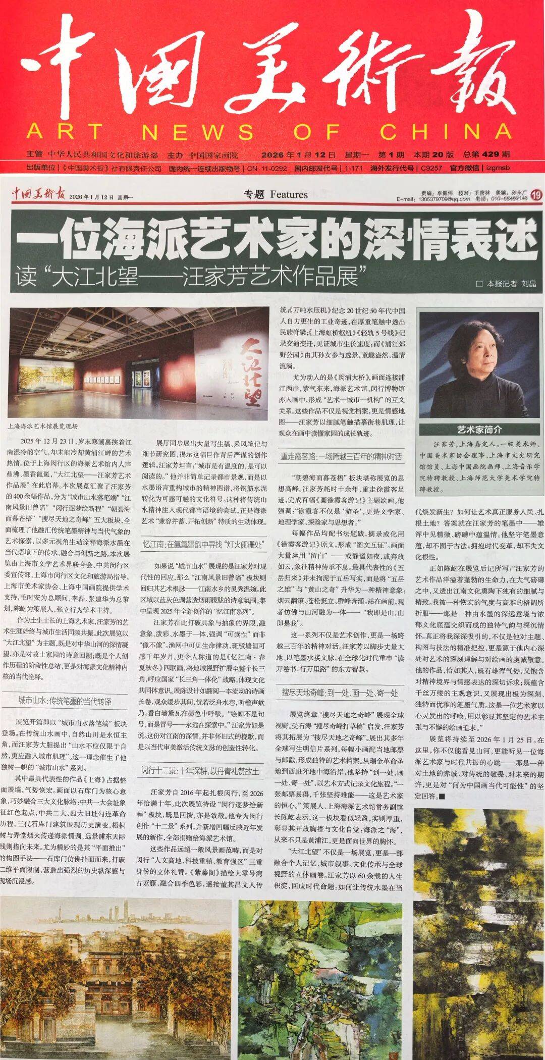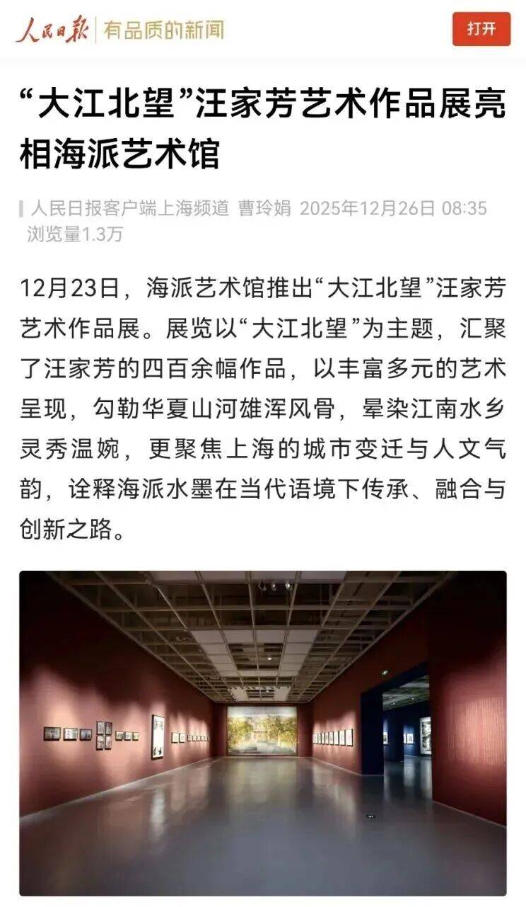 汪家芳是知名的山水画家,近几年作品频频亮相许多重要场合,这次《大江北望》画展是历年展览规模最大,分量最重的大型展览;上海“海派艺术馆”是一家大型的综合性的展览馆,在2025年“热门美术馆及艺术博物馆”榜单中列为全国第54名。所以这次汪家芳的《大江北望》画展在“海派艺术馆”展出可谓精彩缤纷,惊喜不断,吸引了广大爱好者及民众踊跃参观,各家媒体纷纷前往采访及报道。