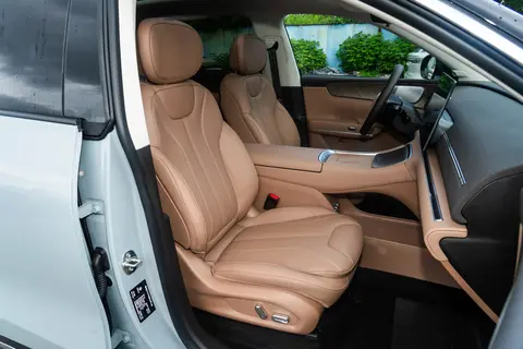 坐进驾驶座,首先应入眼帘的就是多功能方向盘,采用真皮包裹,支持4项调整,还具有加热的功能,严寒的冬天也能够很好的握住方向盘驾驶前行,采用电子式怀挡机构。有一个10.25英寸液晶仪表盘,还有一个17.3英寸2.8k高清悬浮式中控大屏,边框窄至6mm,视觉冲击力十足,画面质感显示清晰,操作流畅。如果有来电显示或者是想带家人去任何一个地方,直接就在中控屏幕上可以操作了,再不用麻烦去打开手机,提升便捷性。还有一款60英寸AR-HUD抬头有显示器,例如导航、车速等一些信息全都折射到前风挡,让驾驶员的视线也不需要频繁移动,再也不用去看手机了,提升安全性,也增加了不少的科技感。车机系统操作便捷,搭载高通8295P芯片,运行Leapmotor OS 4.0系统,语音响应速度比上一代提升了不少,还支持多种模态指令,例如播放一首韩红唱的《天路》,调整空调并打开车窗,这样的组合力也能够很好的完成。无论是家里老人、小孩想到什么就说什么,那都能够轻松应对完成,为家人带来满满的科技感!