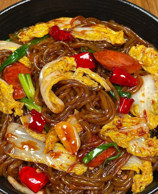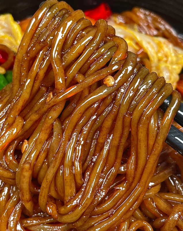 这时候加入泡好的粉条,轻轻翻匀。调个万能酱汁:2勺生抽、半勺老抽(上色用)、一点点糖提鲜、少许 胡椒粉增香,沿锅边淋入,快速翻炒让食材裹上酱色。接着倒入热水,水量刚好没过食材即可。