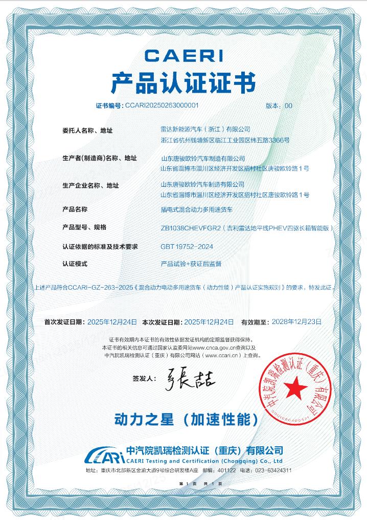 权威认证进一步背书实力,同样搭载雷神 EM-P超级电混系统的雷达地平线PHEV四驱车型通过中汽研凯瑞严苛测试,斩获“动力之星”认证,彰显了吉利雷达在新能源皮卡领域的技术引领地位。