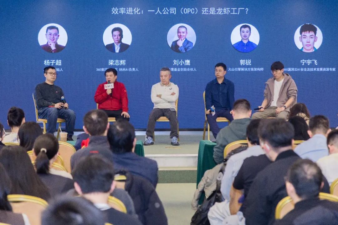 活动下半场的圆桌环节,超声波创始人杨子超,360集团副总裁、纳米AI负责人梁志辉,老鹰基金创始人刘小鹰,火山引擎解决方案架构师郭锐,360漏洞云AI安全及技术发展资深专家宁宇飞围绕《效率进化:一人公司(OPC)还是龙虾工厂》展开深度探讨,并与场下嘉宾:伽利略资本创始人顾浩,TaoZ Capital创始合伙人刘勇,360漏洞云业务线总经理、360教育事业部人才战略与生态发展负责人、HackingClub白帽黑客技术社区发起人胡晓娜互动,碰撞出很多精彩观点。