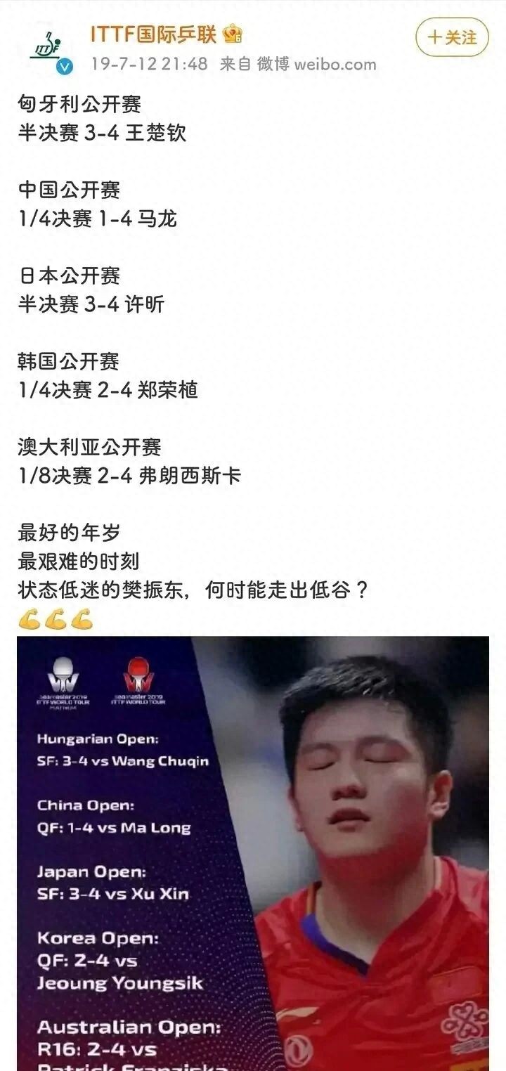 再看国际乒联对他的评价,因在公开赛中连输王楚钦、马龙、许昕、郑荣植和弗朗西斯卡,就称2019年是樊振东低谷。