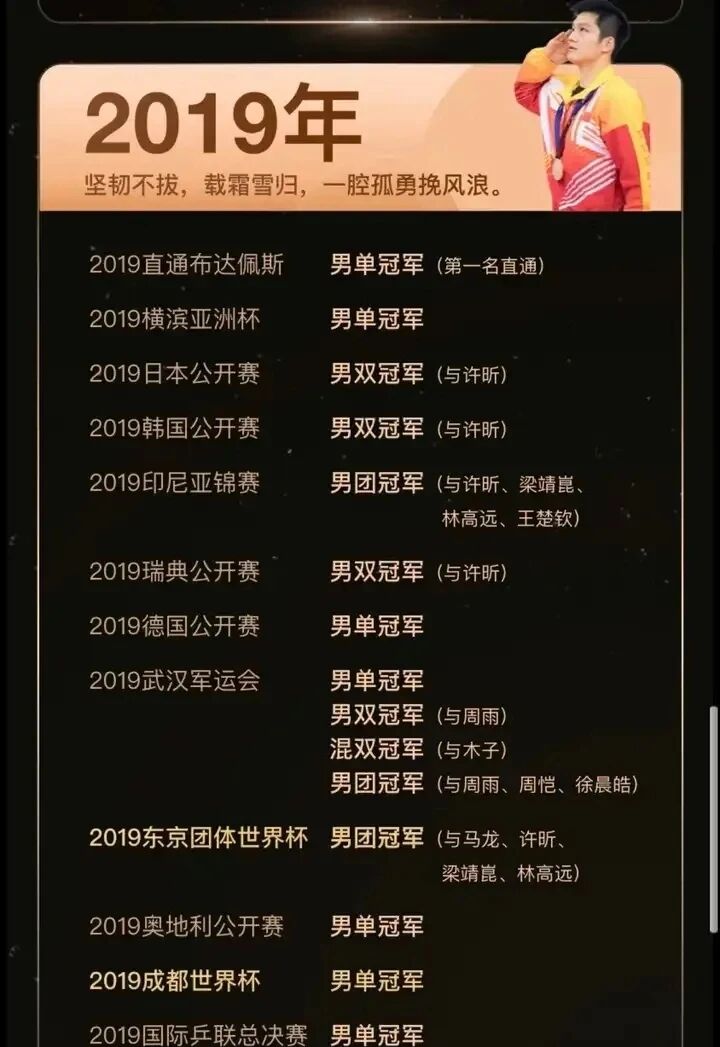 但你得注意,2019年,樊振东也还有亚洲杯单打冠军、世界杯单打冠军、军运会四冠、总决赛单打/双打冠军等有分量的冠军入账。