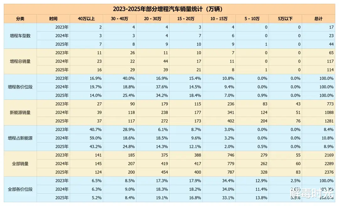 从2023年到2025年,统计到的增程车型数量从17款到23款又增加到44款。2024年较2023年销量接近翻倍,2025年在手动统计到的数据中略微下滑(中国汽车流通协会中数据为123万,统计到的44款总销量约为115万,但基主流的产品都已被统计纳入)。平均单款月销量2023年为3.8万,2024年势头最猛为5万,到了2025年降低为2.6万。超过10万年销量的确是很稳定,在3-4款之间,但总体的占比在2025年下滑到了43.78%。平均月销在5000台以上三年分别为4款、7款和5款,占比在2025年回落到50.81%。平均月销在1000台以上的分别为10款、16款和24款,贡献总销量 80% 以上的车型分别为6款、8款和15款。可见,2025年增程市场最大的变化是车型数量变多带来的结构性调整,如果看不同价位段会更明显。2023年到2025年,40万以上的车型从2款增加到7款,15-20万单车型从3款增加到10款,2025年甚至还出现了一款10万元以下的增程产品。很明显,是各大车企看到增程的发展前景后快速布局车型导致的。