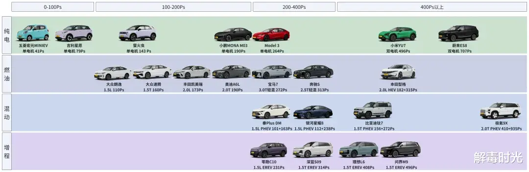 进入到100-200Ps的区间,就来到了燃油车的舒适区。如今多数主销燃油车的动力形式都是1.5L、1.5T、2.0L、2.0T,奥迪A6L的2.0T发动机马力是190Ps,正好落在了这个区间之内。这也构成了10-30万市场中接近800万燃油市场的绝大多数。在这个区间,跟燃油车进行马力竞争的还都是纯电产品,但价格差距体现了两个阵营的不均衡,小鹏MONA M03以10万出头的价格达到了190Ps跟奥迪A6L匹敌的马力水平。200Ps-400Ps的市场出现了非常有趣的格局。燃油车派出了豪华产品,奔驰S和宝马7以300Ps左右的马力成为燃油车主流市场的天花板那,但这个马力也不过是插电式混动和增程产品的起点,一般这两种动力类型都是200Ps起跳。同时纯电车进入了它的甜点区,以特斯拉为代表的新势力纯电产品大多落在20万以上,200Ps马力以上的区间。在400Ps以上,又出现了新的格局。首先普通燃油车退出了竞争,只剩下极其小众的超跑类产品,但同时一类新的动力类型HEV出现了,但由于一些历史路径问题,HEV在国内市场并没有发展起来。纯电车进入了高端领域,在这里纯电遇到了一个最大的问题,即马力和续航的平衡,由于补能便利性还没有达到燃油水平,大马力纯电必然会撞到续航墙,同时更大的电池也会消耗大马力带来的优势,所以长续航大马力的纯电产品并不是一种可广泛普及的产品类型。