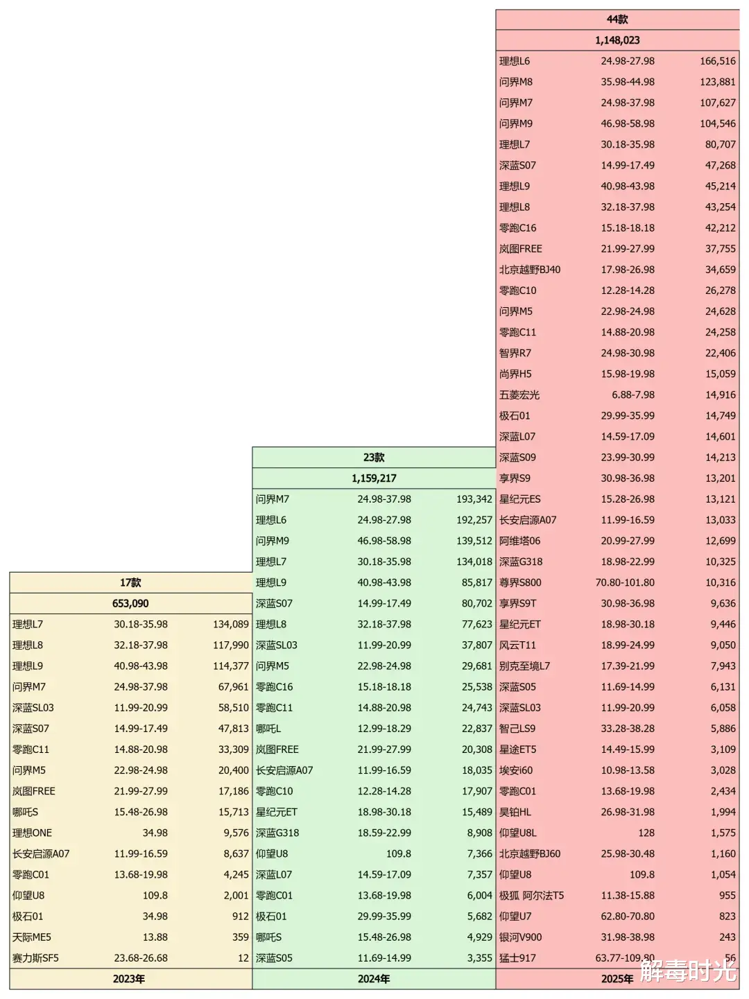 如果单看2025年的增长情况,很可能会得出一个结论——“增程不行了”,不过究竟发生了什么样的变化呢?下面通过手工统计全市场数据情况,还原一下3年来增程车的具体变化。