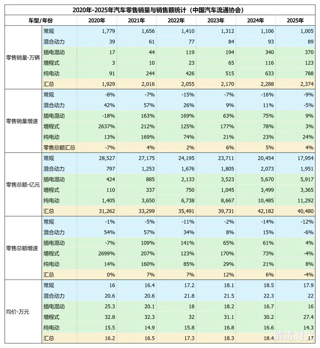 另一个显著的变化是2020年,增程车的平均价格在32.8万元,此后一路下降,到了2025年,已经达到了27.4万元。不过这已经是目前市场上所有能源形式当中,均价最高的。2025年,燃油车均价17.9万元,HEV均价22万,插电式混动均价16万元,纯电动最低,均价14.3万元,全市场口径下总体均价在17万元。