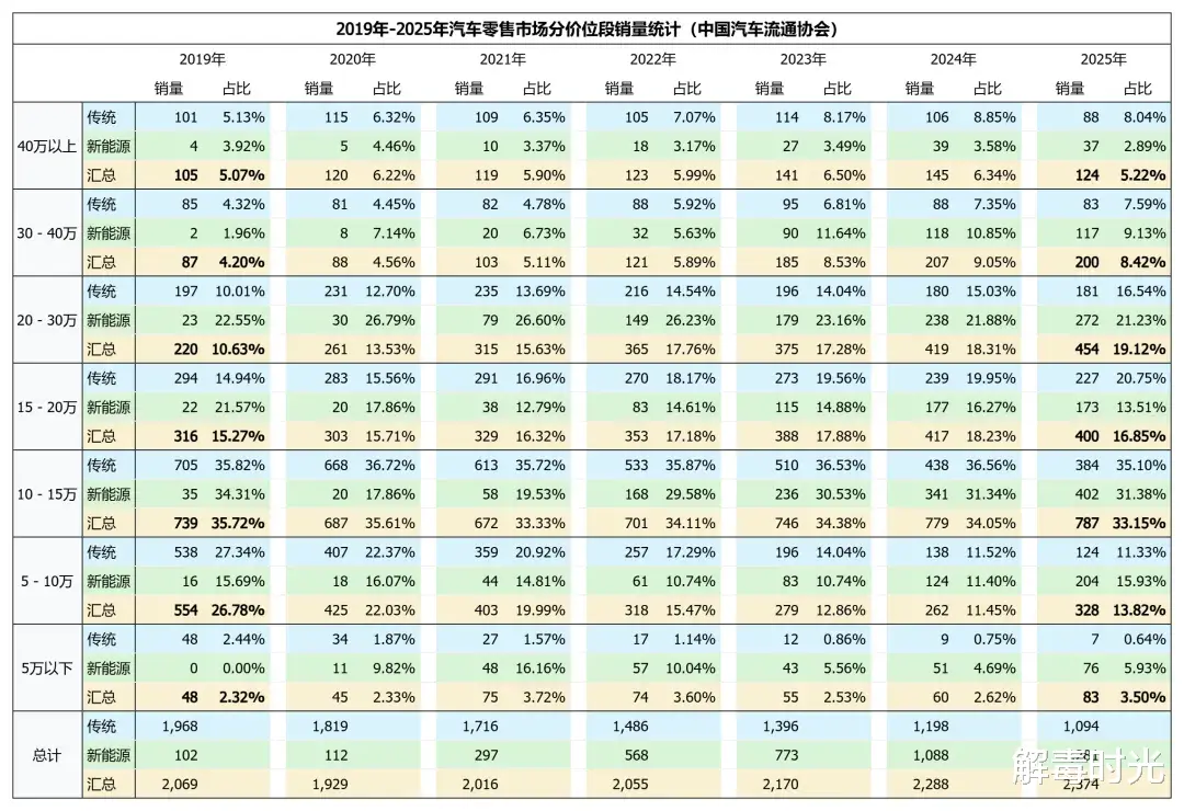 如今,100Ps以下是纯电占有绝对优势的市场,因为车价当中单位马力的成本更低,同时电价便宜带来更低的使用成本,虽然有一定续航的短板,但如果把需求限制在城市通勤范围内,是当前优势非常大的出行解决方案,2025年10万以下纯电小车市场的爆发也说明了这个问题。从销量规模来看2025年,纯电产品已经几乎统治了5万以下的市场,同时在5-10万的市场里也有了接近三分之二的占比。
