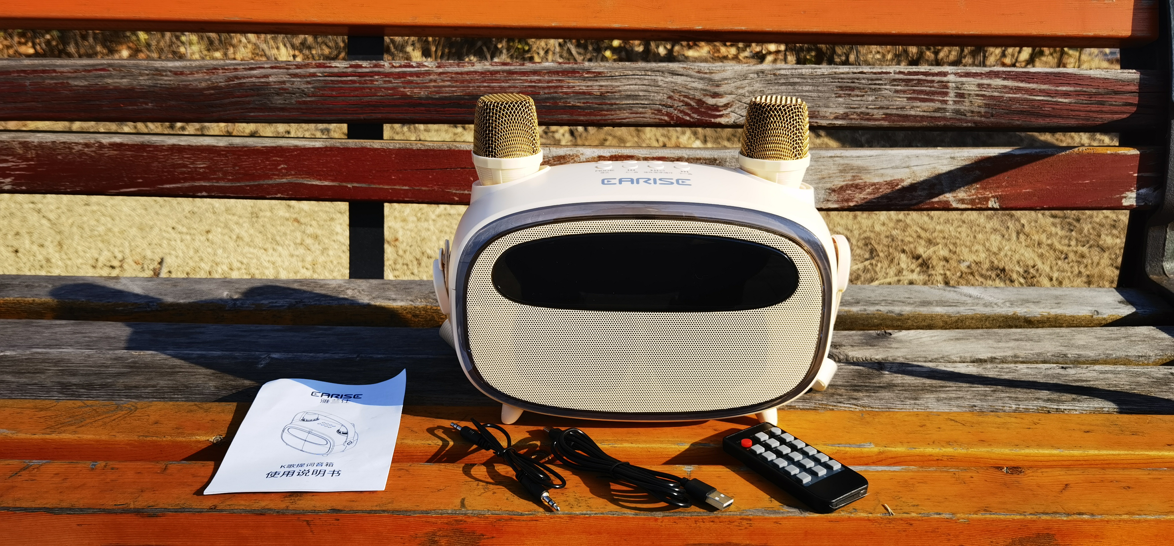 想K歌在楼里怕吵到别人,噪音难听(¬_¬)ノ。开车去露营,在外面吃吃喝喝,却没有其他娱乐项目。想过带投影仪和电视出去K歌,终归太麻烦,一次也没有付诸行动。前一段时间在广场上看到有人拿大音箱唱歌,那上面居然还能出歌词,厚着脸去跟大妈套了一下近乎才知道,原来是雅兰仕提词音箱。