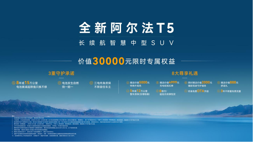 即日起下订全新阿尔法 T5,用户可直接享受价值 3 万元的限时专属权益,更有极狐汽车重磅推出的 “三重守护承诺”—— 行业内唯一同时覆盖 “三电、电池安全、电池衰减” 的保障,彻底打消用户购车顾虑。