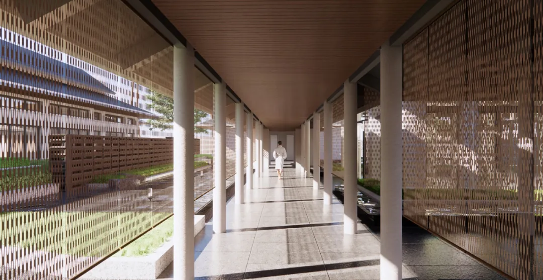 酒店建筑原由Aedas主笔,后由PLAP接手优化。设计师从明代“花月春风十六楼”中的国宾馆“重译楼”汲取灵感,打造了临河而建、正对明城墙的低密度园林式建筑群,呼应了南京的历史印记。