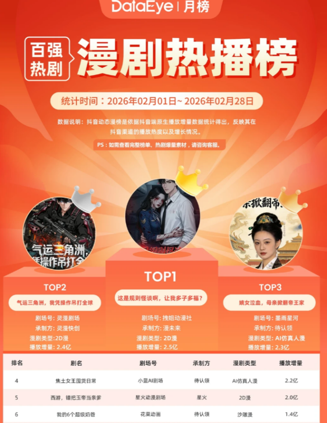 这些调整释放的信号是:平台不想为“低质走量”的内容买单,要把资源集中到真正有长期价值的AI短剧作品上。据DataEye最新数据显示,2026年2月漫剧百强榜中,AI仿真人剧的占比飙升至近60%,百强漫剧总计播放增量达75.87亿,增长绝对值为13.86亿。