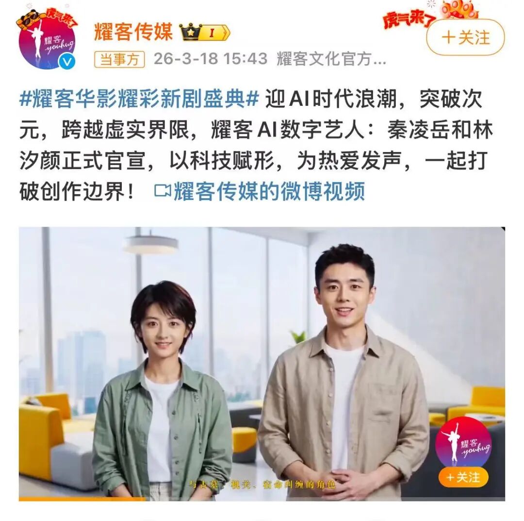 耀客传媒于3月18日官宣签约AI数字艺人秦凌岳和林汐颜,同步推出首部AI剧集《秦岭青铜诡事录》。二人已开通社交媒体账号,以“赛博演员”身份运营,宣称将分享“日常”并与网友互动,甚至强调“不留电子眼泪”,试图营造与真实艺人无异的运营模式。