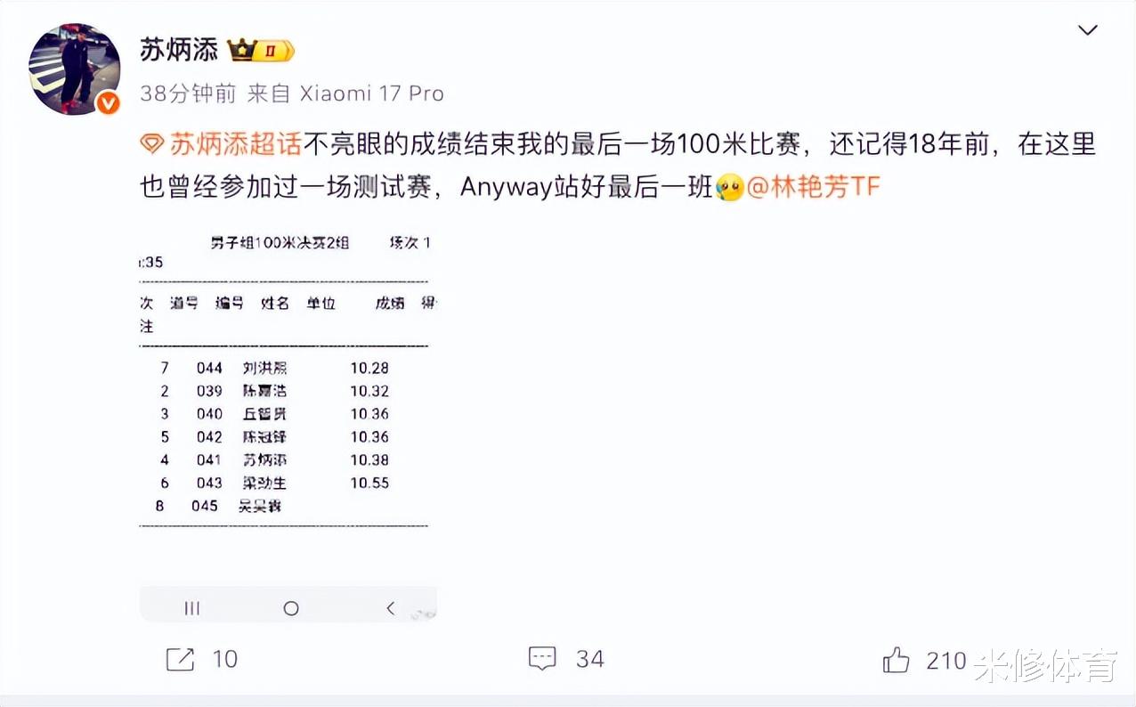 10月17日晚,苏炳添晒出一张成绩单,他说:“不亮眼的成绩结束我的最后一场100米比赛,还记得18年前,在这里也曾经参加过一场测试赛,Anyway站好最后一班。”