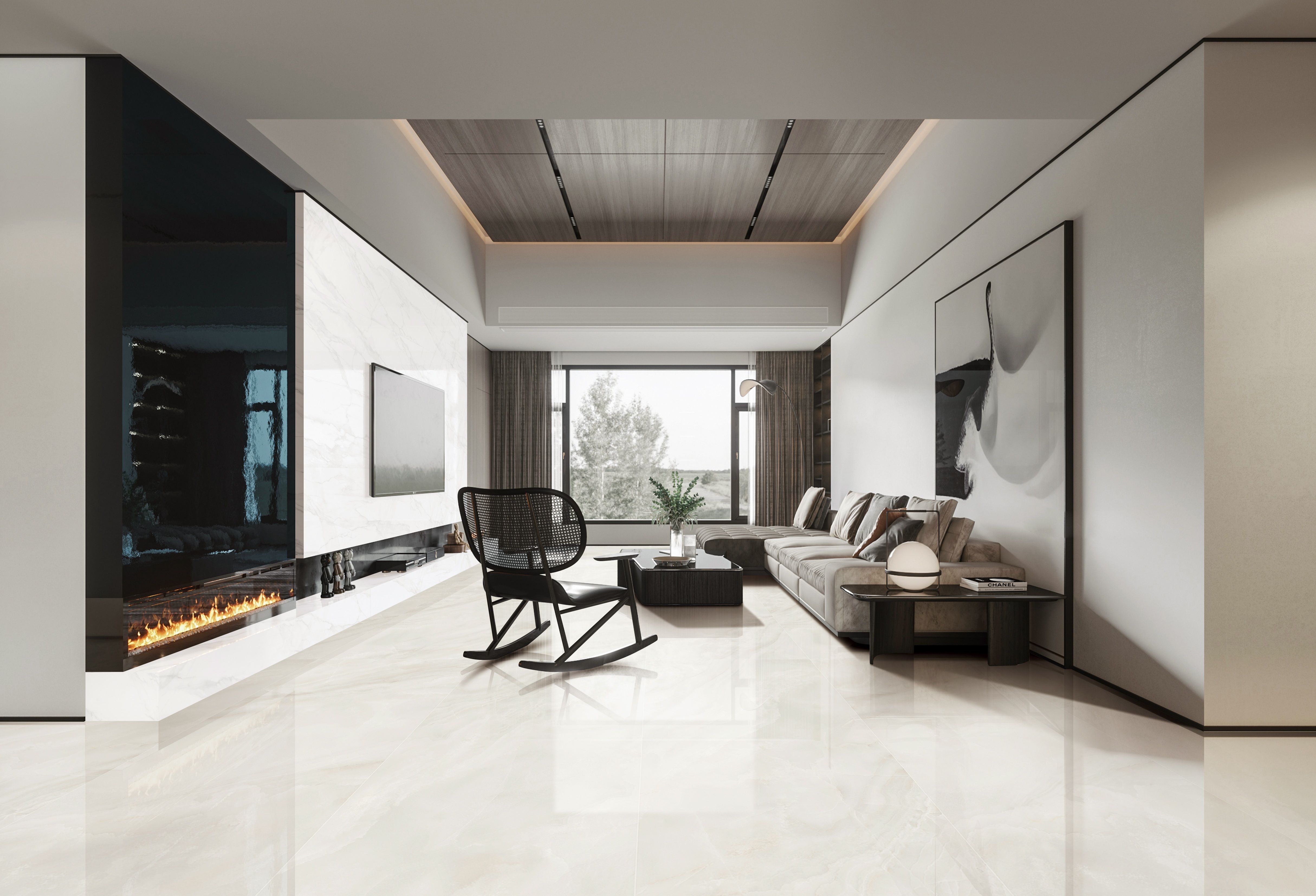 若追求开阔感与高级感,可选用如上图中国际瓷砖品牌罗曼缔克大规格浅色大理石纹理瓷砖满铺地面。其浅米白基底搭配自然肌理,既显空间通透,又通过镜面光泽度拉伸视觉纵深。搭配深灰金属家具、质感布艺沙发,再以黑色艺术灯具点缀,能在 “冷调高级” 与 “生活温度” 间找到平衡,让客厅成为兼具会客气场与休闲氛围的质感空间。