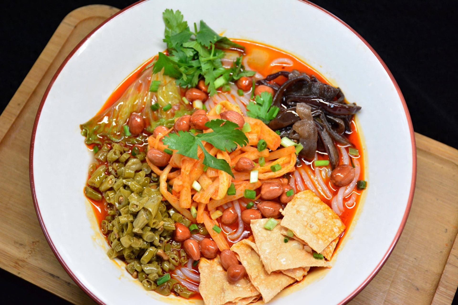 滤粉来自融安,是自治区级的非物质文化遗产。将米浆通过特制漏斗滤入沸水,现做现吃,粉条滑嫩爽口。配上头菜、花生、叉烧,浇一勺卤水,清淡中见真章。最特别的是配一个网油烧炙——用猪网油包裹肉馅烤制,外酥里嫩。与螺蛳粉的浓烈不同,滤粉吃的是米的本味,是柳州人清晨最温柔的打开方式。