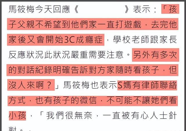 此前马筱梅回应媒体说不让孩子范玮琪家是因为去了会一直打游戏,随后S家的亲朋好友又出现了,说孩子去范玮琪家玩的都是桌游,下象棋、五子棋,为范玮琪孩子发声,还称当时小S陷入低潮,看到孩子跟双胞胎玩的开心,自己也很感谢范玮琪家。但也没说S家会主动去看孩子。