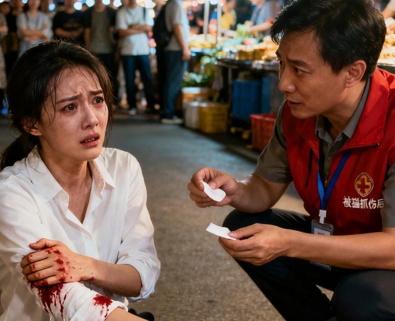 她猛地往后一仰,重心不稳跌坐在地上,左手紧紧捂住右臂,血从指缝间渗出来,在白衬衫袖口迅速染出几抹鲜红。周围人群一阵骚动,有人惊呼,有人下意识地后退,气氛瞬间紧张起来。唐婧雯皱着眉,嘴角微微颤抖,脸色因为疼痛和惊吓而发白。她试图站起,但腿软得厉害,只得撑着地面缓缓挪动。同事赶紧扶她起来,语气中带着责备和慌张:“你疯了?怎么能随便伸手进去!”
