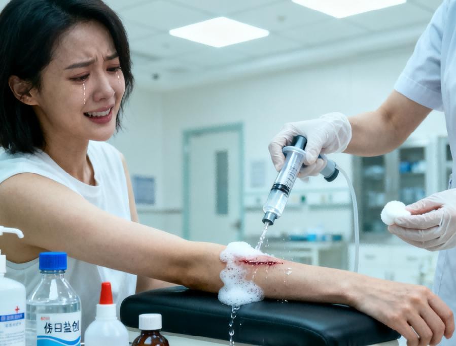 “先高压清洗。”医生一边说,一边拿起灌注器,注满生理盐水,持续冲洗伤口表面。水流冲击在皮肤上,像一阵阵针刺,唐婧雯疼得身子微微颤抖,却一声不吭,牙关紧咬。医生连续更换两轮生理盐水后,又用碘伏棉球仔细擦拭每一道抓痕的边缘,随后更换为3%过氧化氢,伤口顿时冒出一阵细密的白色泡沫,发出“滋滋”的声音,像在伤口深处发酵。