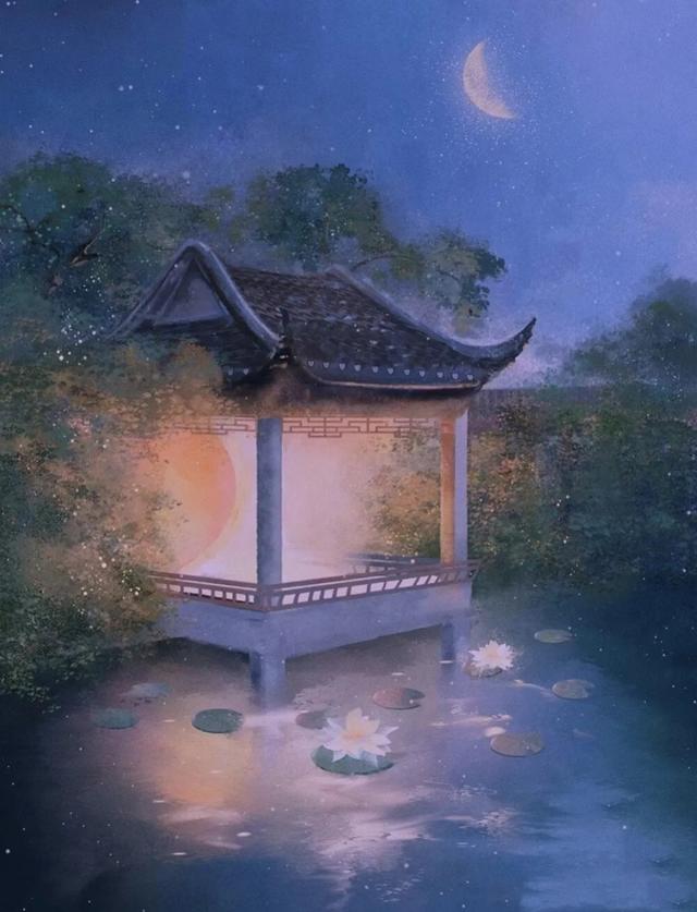 这种以景结情的夏夜,很容易让人想起谢逸的“人散后,一钩新月天如水”,画面宁静而深远,意境淡雅而迷惘。