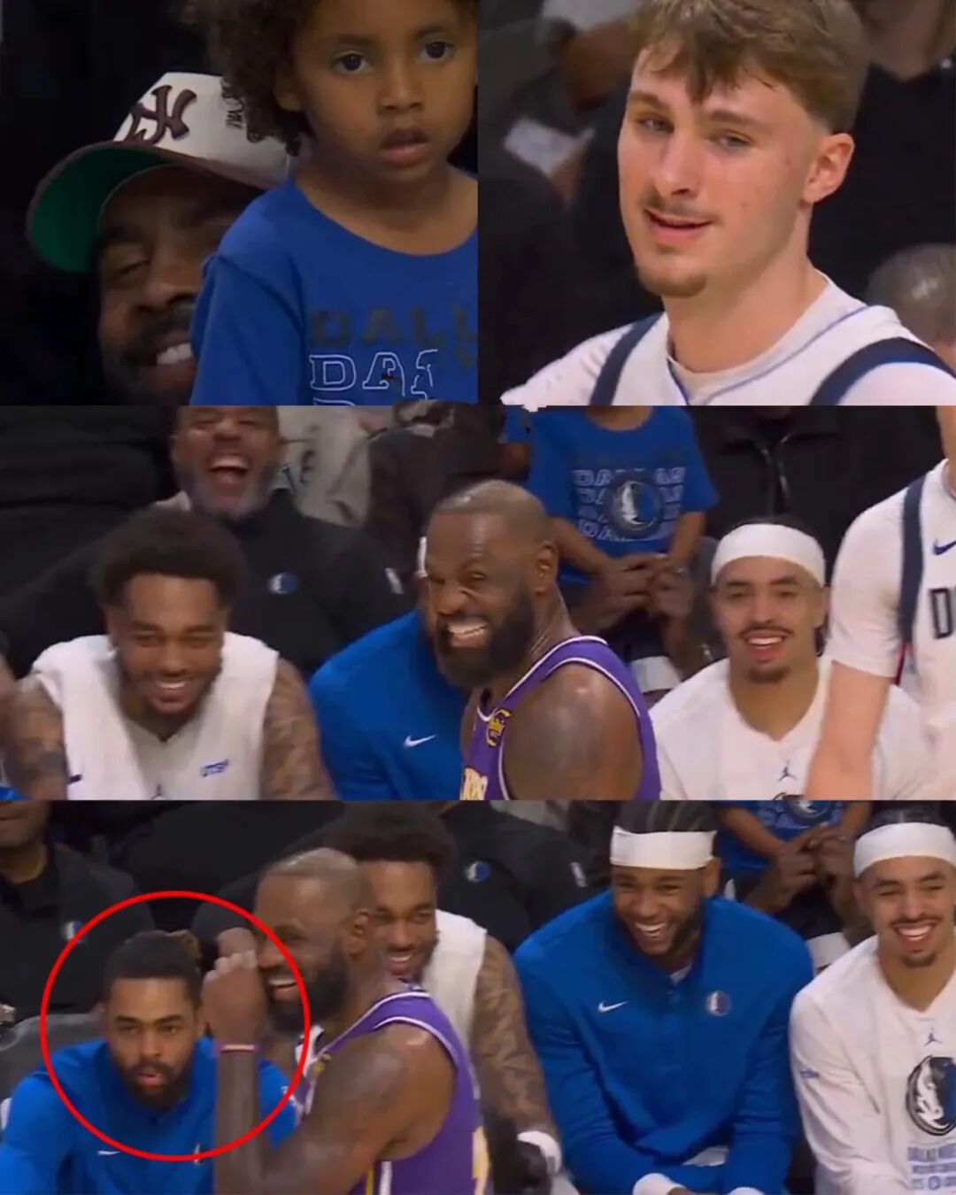 其中对阵湖人的比赛,拉塞尔还被拍到了有趣一幕,当时詹姆斯和替补席上的欧文聊天,场上的弗拉格、替补席的球员甚至后排助教都被逗得笑了出来,只有拉塞尔一人面无表情。