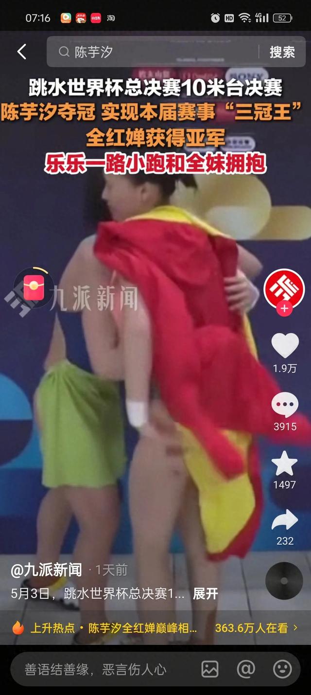 陈芋汐夺冠也是一路小跑过去拥抱全红婵,既是对全红婵成绩的肯定也是对她的鼓励,她们是彼此成长路上最好的伙伴,一路披荆斩棘,太不容易了。看到这样的互相奔赴的场景确实令人欣慰,两位姑娘都是好样的。