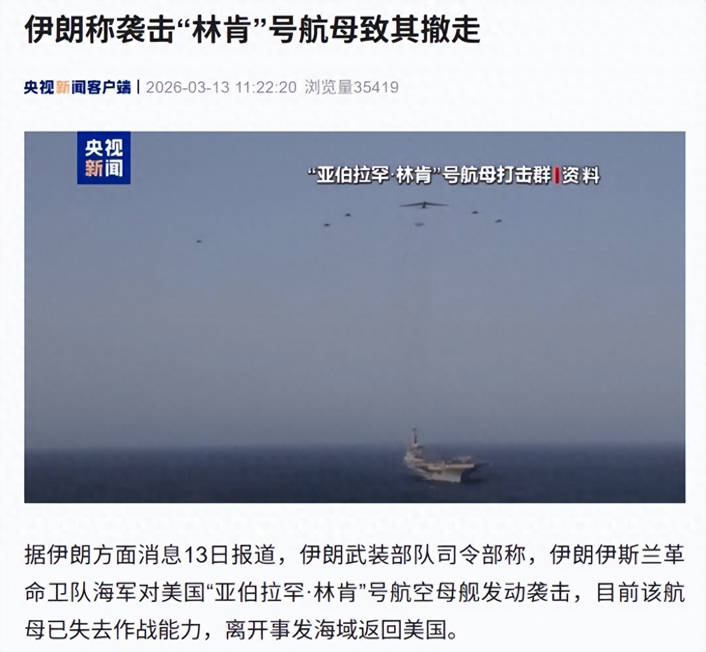 伊朗:袭击“林肯”号航母,已致其失去作战能力返回美国!美方:击中靠近航母的伊朗船只,“海军多次炮击不中,直升机射导弹命中”——每日经济新闻 03-13 13:34:35
