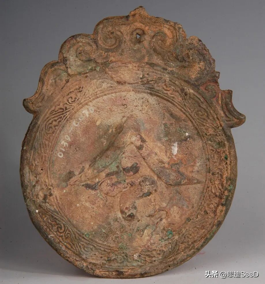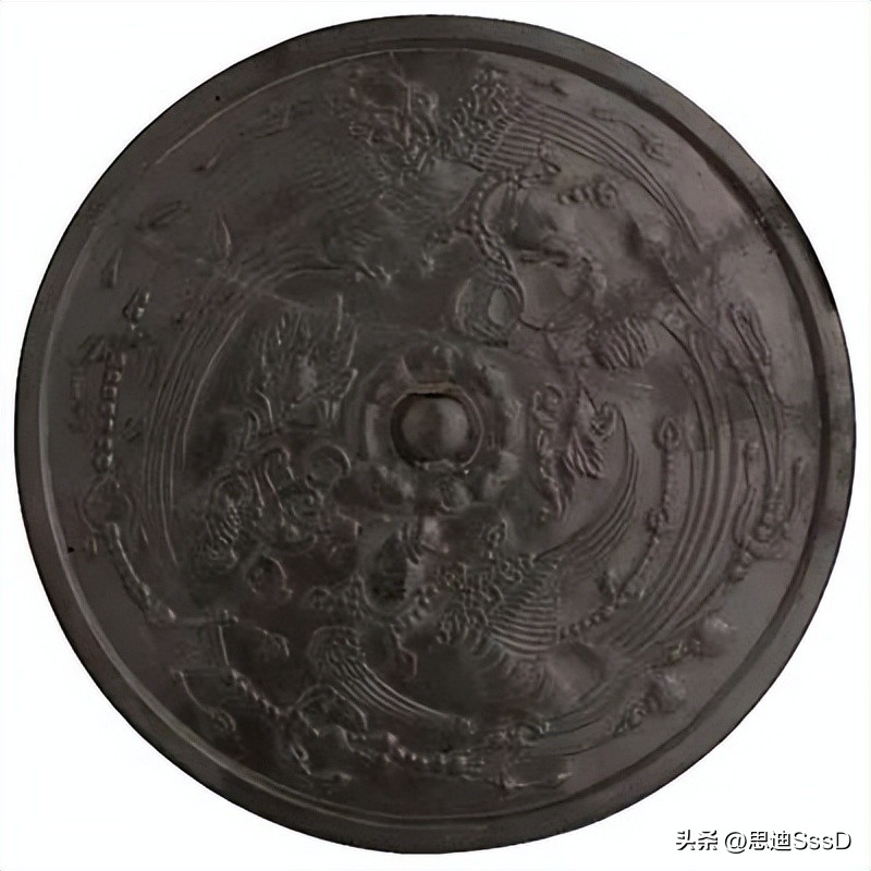 唐鹦鹉衔枝绶带纹铜镜,直径33.5厘米,缘厚0.8厘米,重3177克,1990年安庆本地农民在翻挖宅基地时偶然发现,后捐赠给安庆博物馆。铜镜质地精良,器表黑亮中透着银光,圆形,圆钮,连珠纹钮座,窄平缘。
