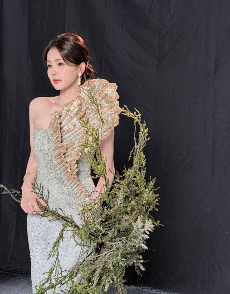RAHUL MISHRA 2026春夏高定单肩贝壳裙,肌理感十足的面料搭配金箔、水晶与金属丝编织,灯光下光泽灵动,完美勾勒婀娜身形,简约又精致,把年轻女星的轻盈与贵气平衡得恰到好处。