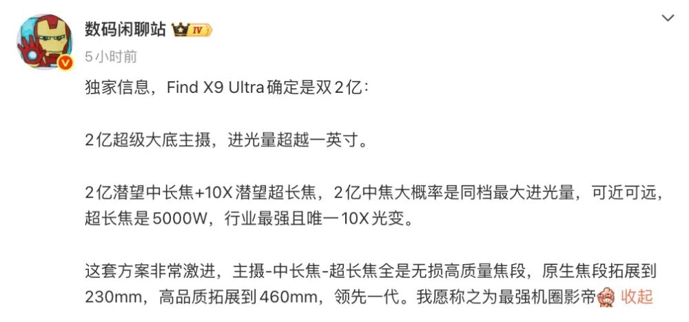 参考博主@数码闲聊站 的爆料来看,OPPO Find X9 Ultra确定是双2亿。