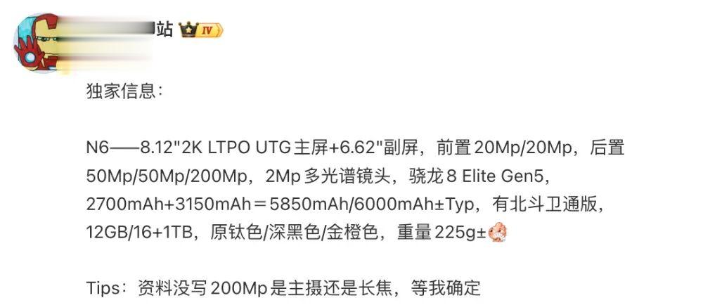 其他规格方面,这份爆料中显示,OPPO Find N6将配备8.12英寸2K LTPO UTG主屏、6.62英寸副屏,核心搭载骁龙8 Elite Gen5,电池为2700mAh+3150mAh=5850mAh/6000mAh±Typ,有北斗卫通版,12GB/16GB+1TB存储规格,提供原钛色、深黑色、金橙色等可选配色,整机重量为225g±。
