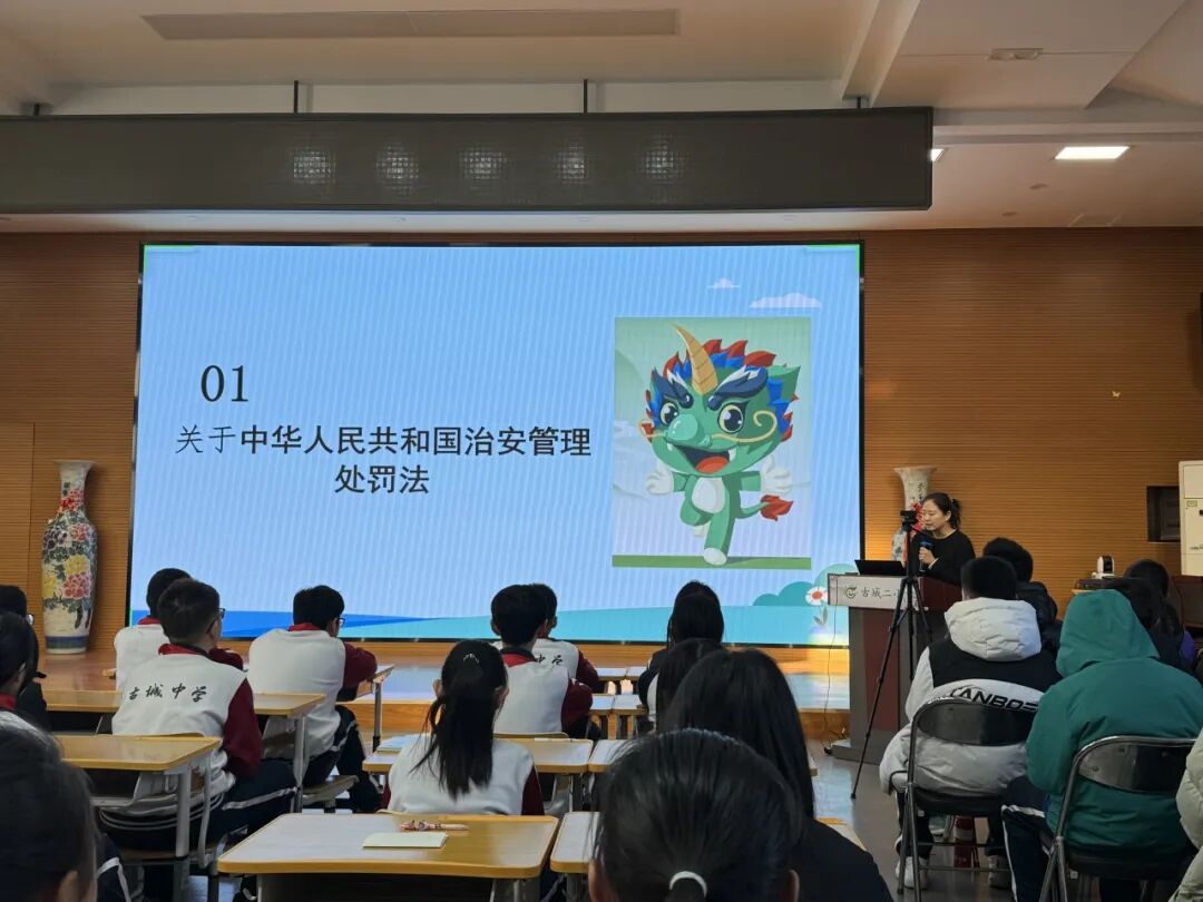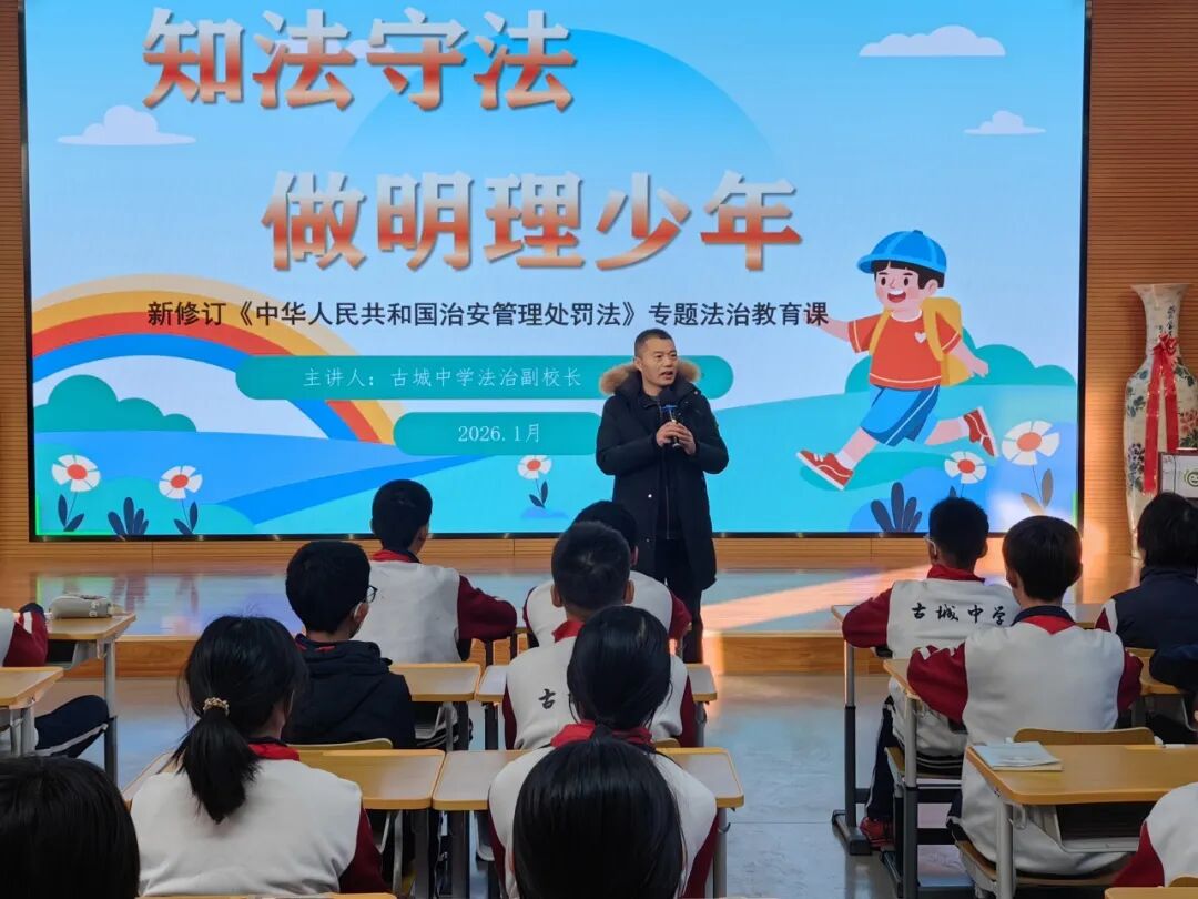 2026年1月21日,北京市古城中学主校区报告厅内气氛热烈,一场以“知法守法,做明理少年”为主题的新修订《中华人民共和国治安管理处罚法》专题法治教育讲座在此举行。