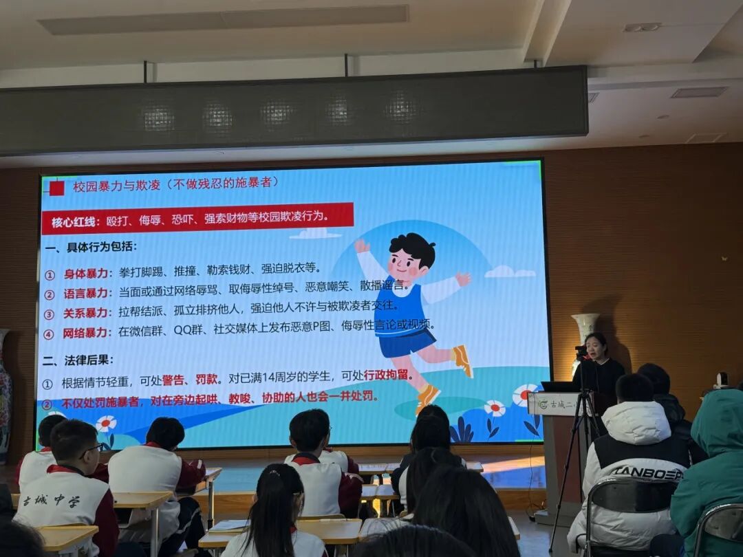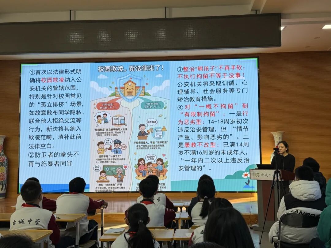 2026年1月21日,北京市古城中学主校区报告厅内气氛热烈,一场以“知法守法,做明理少年”为主题的新修订《中华人民共和国
